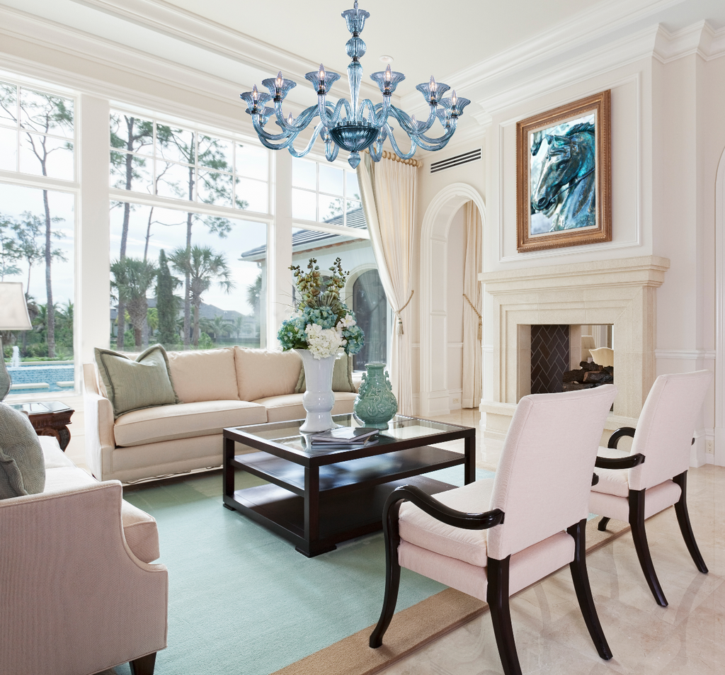 The Marcella Blue Glass Chandelier is a standout piece when it comes to Art Deco lighting. The traditional styling is made new by offering a bright, unconventional color. The arms curve exquisitely in grooved blue glass from a sculptured glass core belted with polished stainless steel, creating a unique silhouette for this colored glass chandelier.